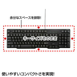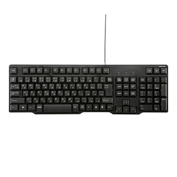 (防水・防滴仕様ではありません)<仕様>■カラー:ブラック■サイズ:W443×D141×H27mm■ケーブル長:約1.4m■重量:約520g■インターフェース:USB■コネクタ:USB Aコネクタ■キースイッチ:メンブレン■キー/キー表示:109+3/日本語(かな付)■キーストローク:2.4±0.1mm■動作力:65±5g■消費電流:100mA以下■付属品:取扱説明書 ■対応OS:Windows10・8.1・8・ 7・Vista・XP■対応機種:各社DOS/Vパソコン※ただし、USBポートを持ち、パソコン本体メーカーがUSBポートの動作を保証している機種。